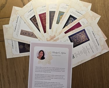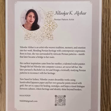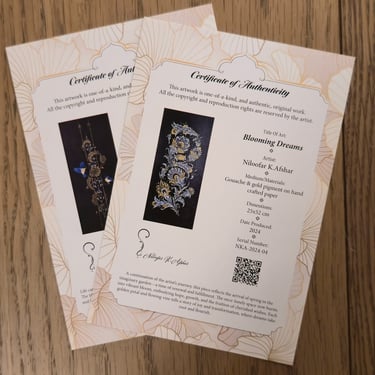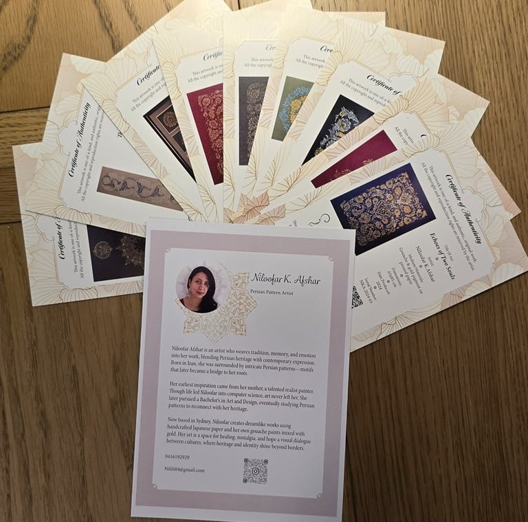 Blending clean typography with subtle design elements, I crafted a layout that reflects my identity as a Persian pattern artist while maintaining professional clarity. The design balances elegance with function, aligning the certificate with gallery standards and collector expectations.