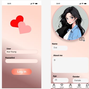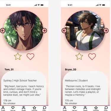 – Fantasy Dating App: My second, more advanced project features adorable anime characters as user profiles, splash screens, interactive motion triggers, and character-driven UI. It’s playful, intuitive, and built to explore how design can feel personal and alive.